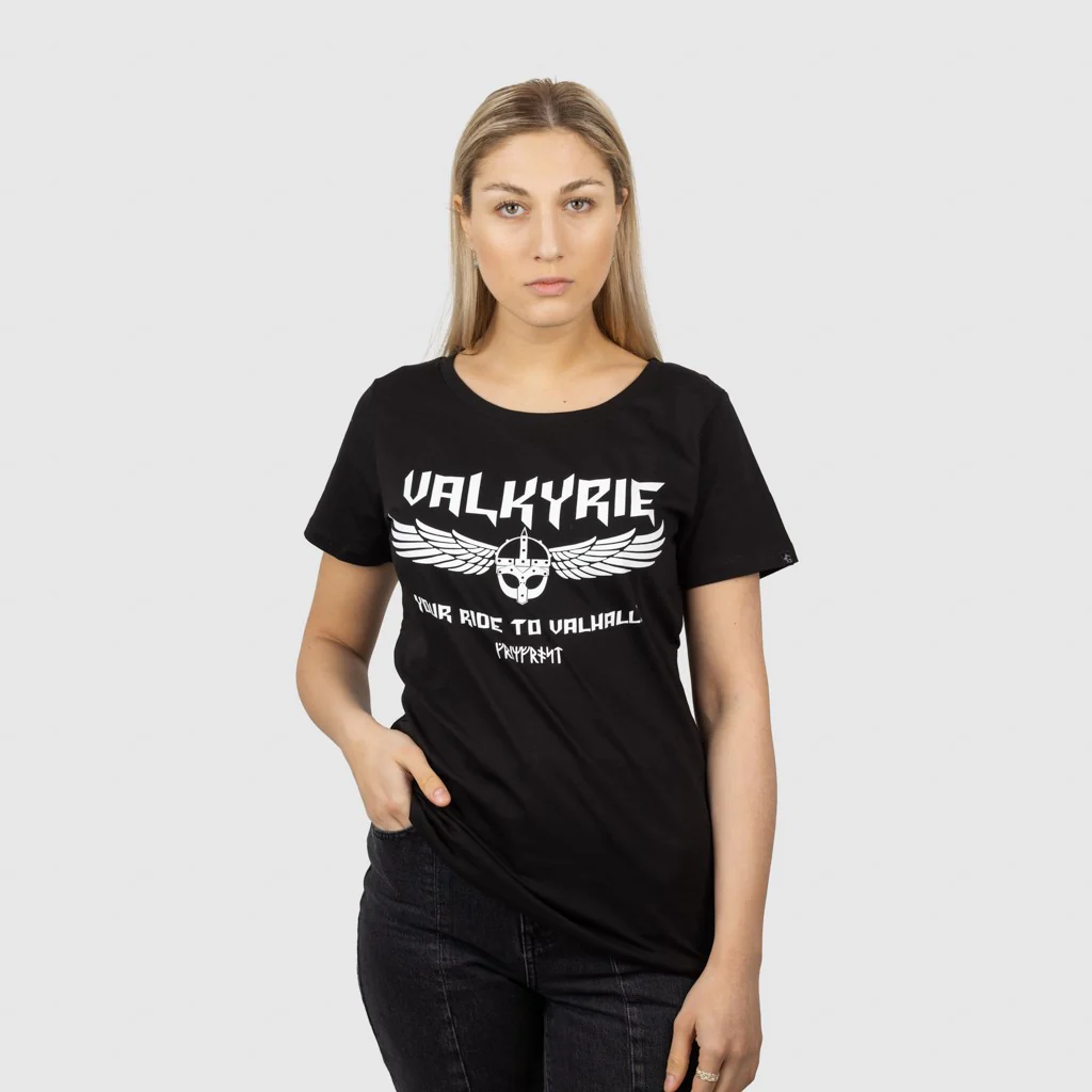 The shirt is printed with "Valkyrie - Your Ride to Valhalla" and a Valkyrie's helmet with a pair of wings symbolizing their ability to fly.