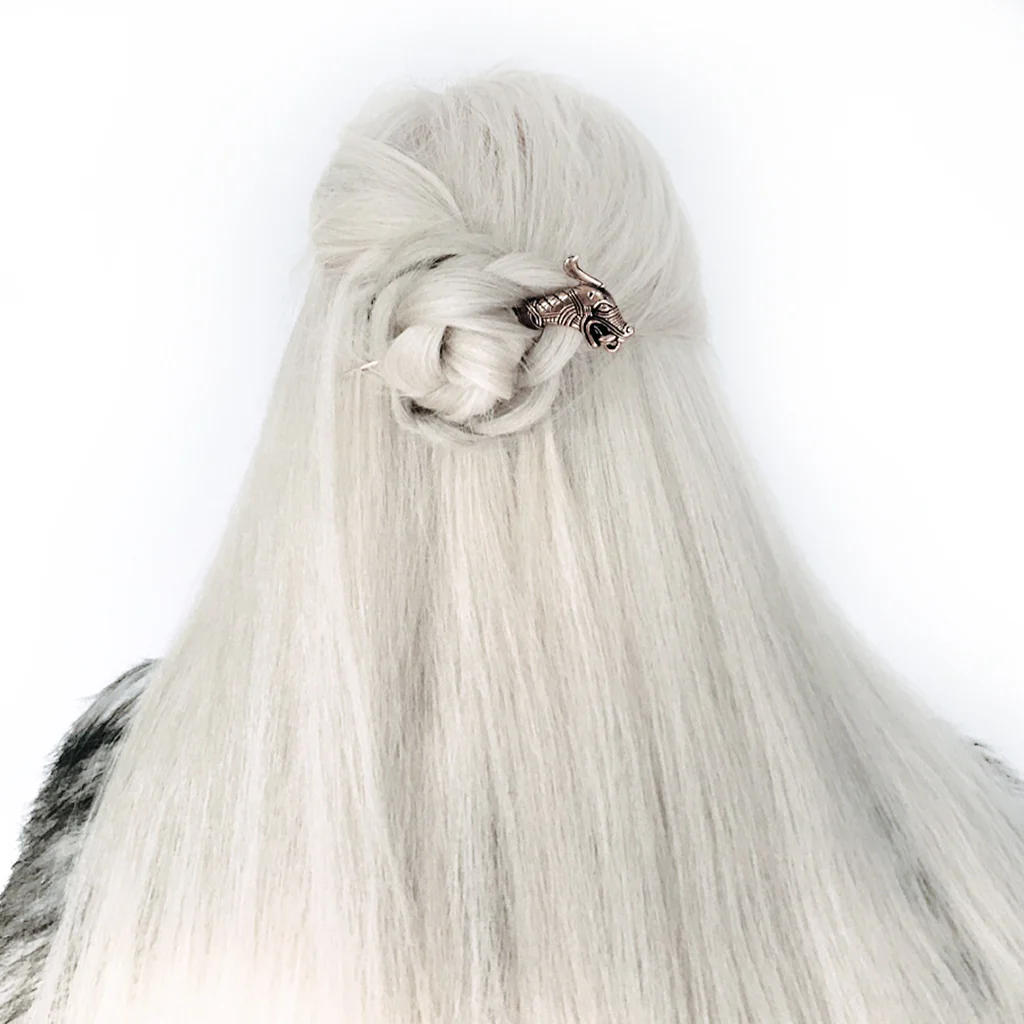 Bronze hairpin with a dragon's head that also works as a pin for clothing. It is a reproduction of the 10th Century original item that was found during excavations in the Viking settlement of Hedeby.Â
