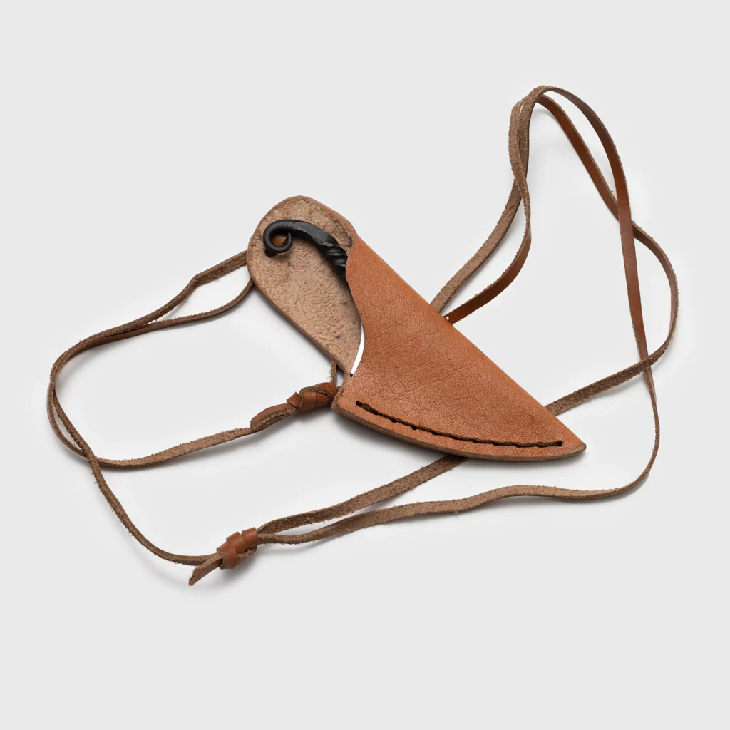 General purpose knife that can be worn around the neck. It has a handforged, sharpened carbon steel blade. The leather sheath is hand-stitched.