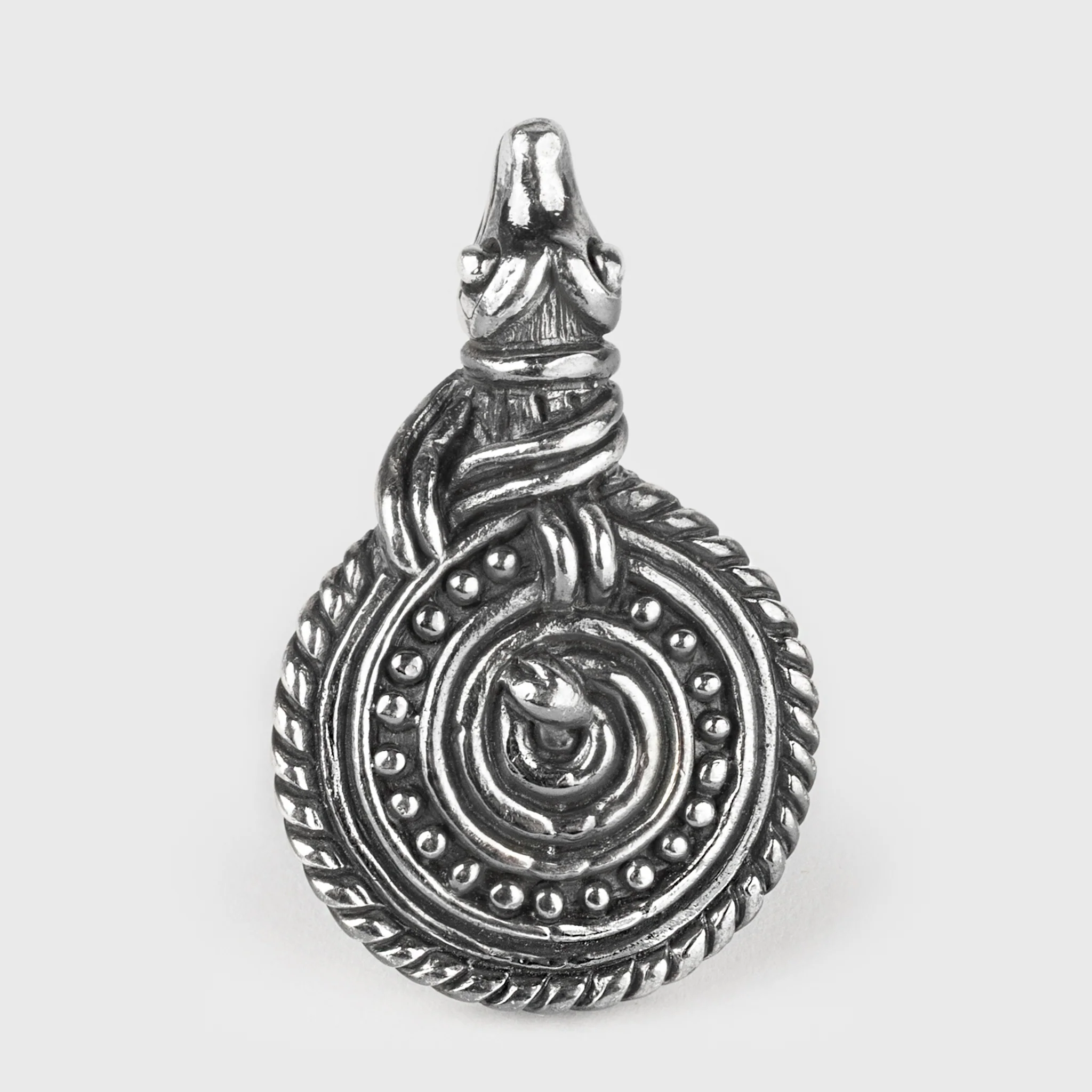 Reproduction of a pendant found in the remarkable Viking Age treasure in Eketorp, Sweden. Just as the original, it has been crafted in genuine silver. It depicts a coiled snake, which fits well with Níðhöggr in Norse mythology.