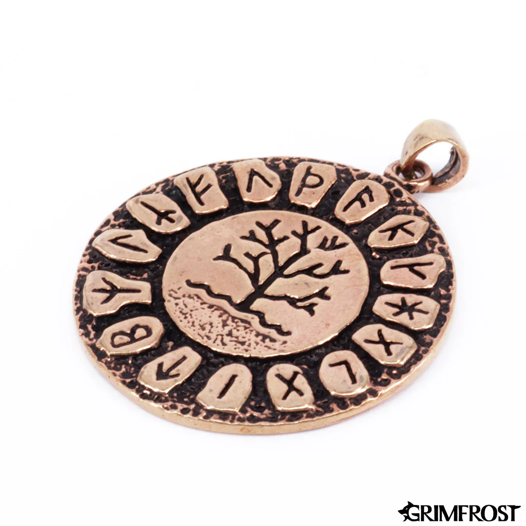 An Yggdrasil amulet in bronze surrounded by a runic circle.