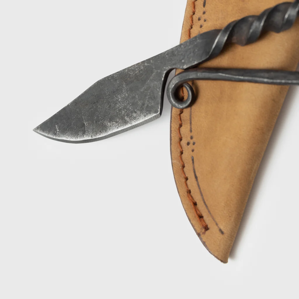 Hand forged steel reproduction of a Viking general-purpose knife, known as a "Krumkniv" (English: Bent Knife). The blade is sharpened and the handle is forged in a twisted, spiral pattern. Grimfrost in runes is stamped onto the blade. If the knife is intended for heavy usage, then we recommend to wrap the grip with leather straps.Â