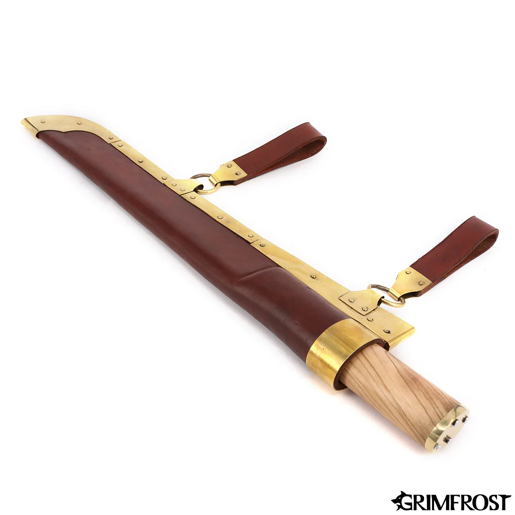 This hand-forged seax is of the design that was common among the Vikings (Norse Type II). The sax (English: seax) is a long knife characterized by a large, single-edged blade worn horizontally inside a scabbard attached to the belt, with the edge of the blade upwards. It was historically seen with Germanic peoples, and gave among other things the Saxons their name. This particular shape and design was common in Viking Age Scandinavia, where the curved side of the blade was sharpened, rather than the straight side.